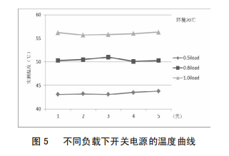 改进后,为验证改进效果,对开关电源分别在0.5倍、0.8倍及1.0倍负载下进行了为期5天的带负荷试验,图5为不同负载下开关电源的温度曲线,由图5可知,随着负荷的增大,开关电源问题总体呈上升趋势;负载不变的情况下,同一温度曲线基本保持平滑;开关电源在额定负载下运行,最高温度不超过57℃,未达报警值,开关电源可靠性得到显著提高。