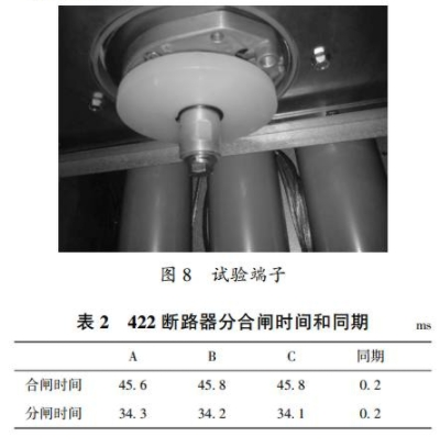 本次实验选取422断路器进行机械特性测验,按图6进行实验接线。将4221阻隔开关置于接地位置,将实验端子接到柜内电缆接口,然后将实验线接到实验端子下端进行实验。实验端子如图8所示。422断路器分合闸时刻和同期见表2。