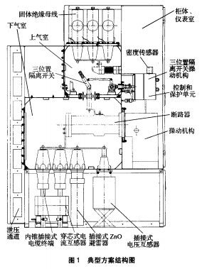 (1)高压主电路的气体绝缘技术和插接技术:对主电路电场进行了优化,以低压力SF6气体作绝缘介质;开发了内锥、外锥插接式电缆终端头,插接式固体绝缘母线,选用硅橡胶绝缘的十字联接套,端头T形联接套,插接式电压互感器和避雷器。