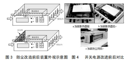 3.2在装置本体进风孔加防尘网,避免尘埃进入装置内部,设备保护人员定时对滤网中止清扫,然后减轻元器件表面覆尘,利于装置正常散热,如图3所示加装防尘网后开关电源表明图。对装置实施上述改进后,其改进前后对比如图4所示。